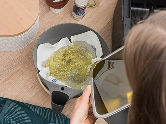 Bevor das Öl durch den Filter läuft, sammelst du mit einer Schöpfkelle große Brösel und Essensreste heraus. Wichtig ist, dass du das Öl ausreichend abkühlen lässt: Eine Temperatur zwischen 50 und 75 °C ist ideal. In diesem Bereich ist das Fett noch flüssig genug und das Verletzungsrisiko durch heiße Spritzer wird deutlich verringert.