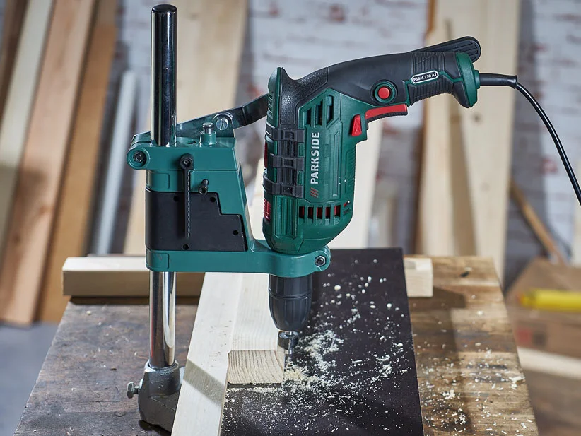 Bohrmaschine eingespannt in einen Bohrmaschinenständer