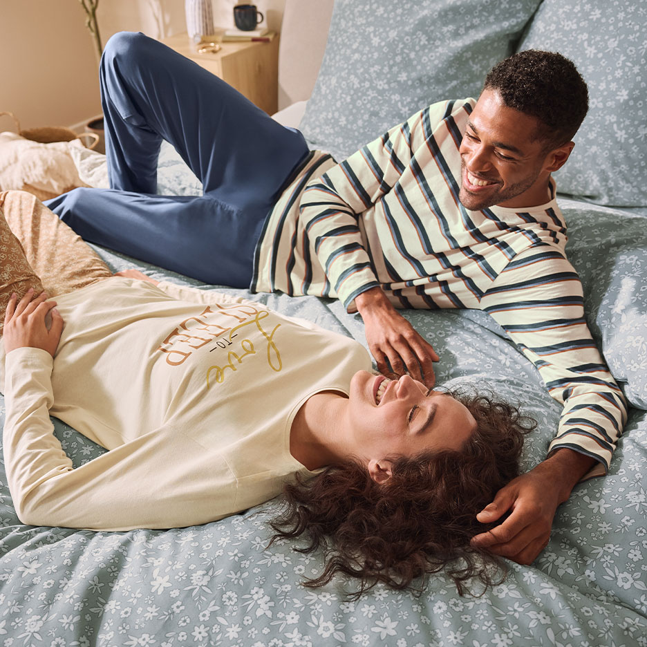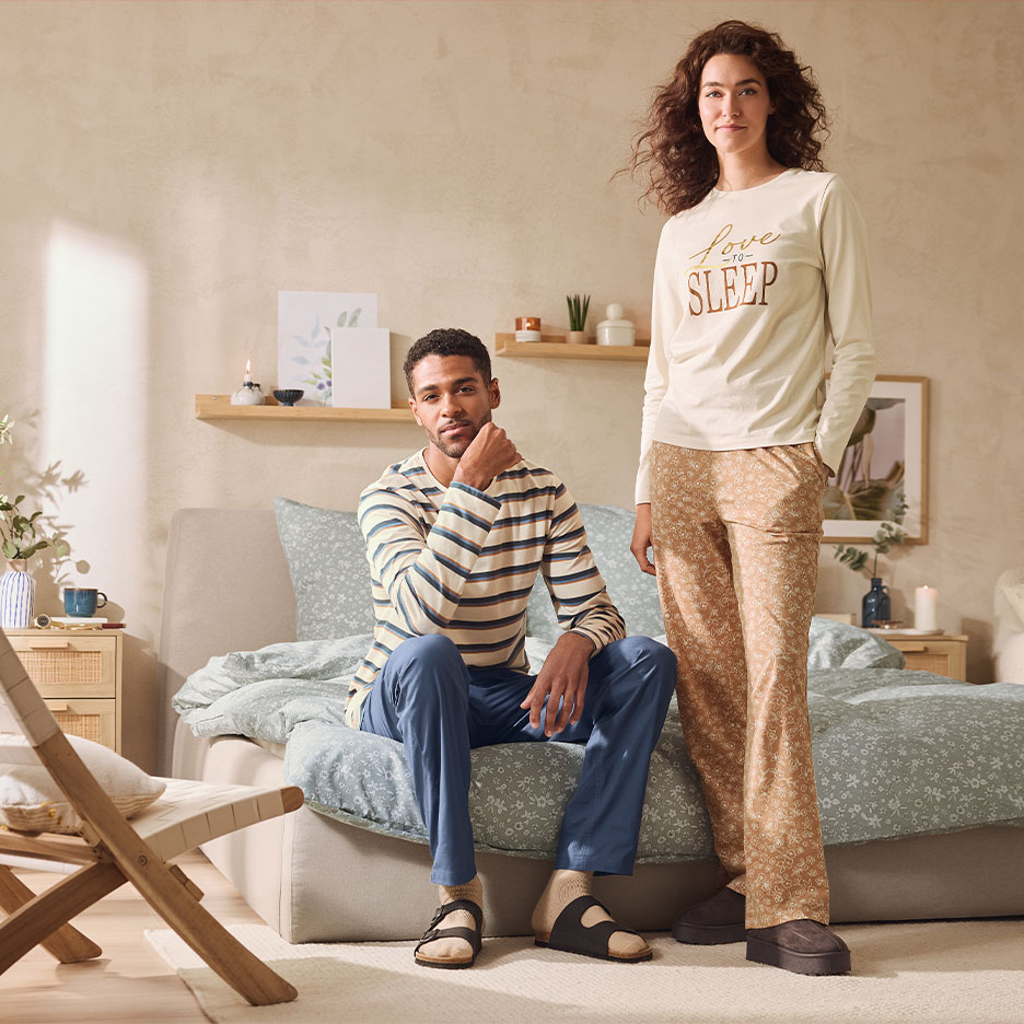Unbequeme Verschlüsse oder starrer Sitz? Kommt nicht in die Tüte! Bei Pyjamas regieren Flexi-Bündchen, Gummizüge und Bindebänder. Die Passform ist relaxed, die Schnitte sind komfortabel, und du kannst deine Loungewear nach Lust und Laune mischen. Vom Sweatshirt-Style bis zum edlen Pyjama-Hemd mit Knopfleiste entscheidest du selbst, wie du entspannen willst. Achte im Winter darauf, dass Arme und Beine möglichst bedeckt sind. Denn hier verliert der Körper im Schlaf am schnellsten an Temperatur.