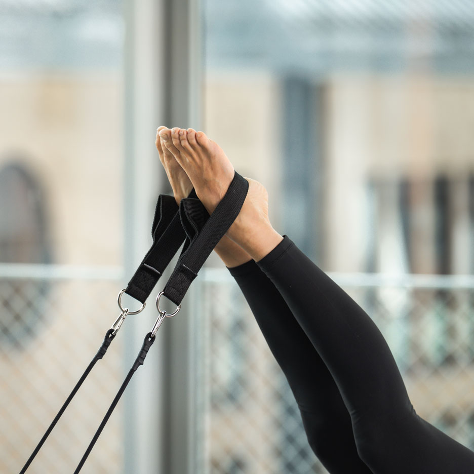 Für die nächste Serie bringst du in Rückenlage deine Füße in die langen Schlaufen.