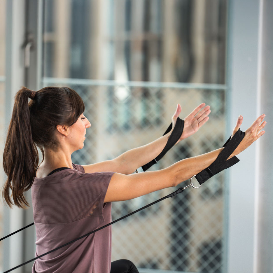 Im Sitzen hast du die Schlaufen in den Händen, die Ellenbogen sind gebeugt, die Handflächen zeigen nach oben. „Bei der Ausatmung streckst du deine Arme nach vorne auf Schulterhöhe aus. Öffne die Arme dann in die Seite, schließe sie wieder und beuge die Ellenbogen dann wieder.“