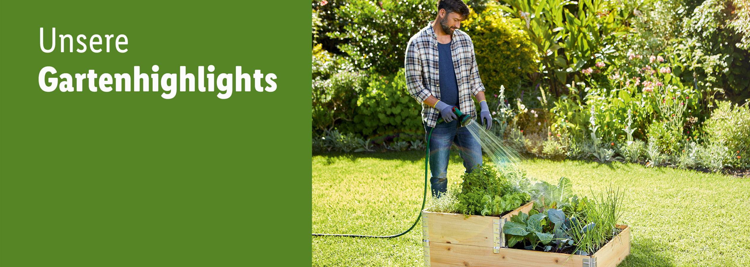 Mann bewässert Kräuter und Gemüse in Hochbeeten.