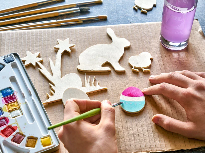 Eines der beliebtesten Motive zum Osterfest ist der Osterhase. Der Körper ist vergleichsweise simpel auszusägen. Reduziere beim Ausschneiden der Ohren jedoch die Geschwindigkeit der Säge, damit bei dem scharfen Winkel zwischen den Ohren keine Verbrennungen entstehen. Dasselbe gilt für den Schnabel von Küken. Ostereier hingegen sind keine große Herausforderung und können schnell in einer Vielzahl ausgesägt werden.