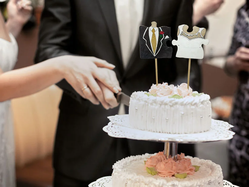 Wer besonders ambitioniert ist, kann auch ein Hochzeitspaar für die Spitze der Torte sägen. Eine passende Vorlage findet sich ebenfalls unter den Downloads.